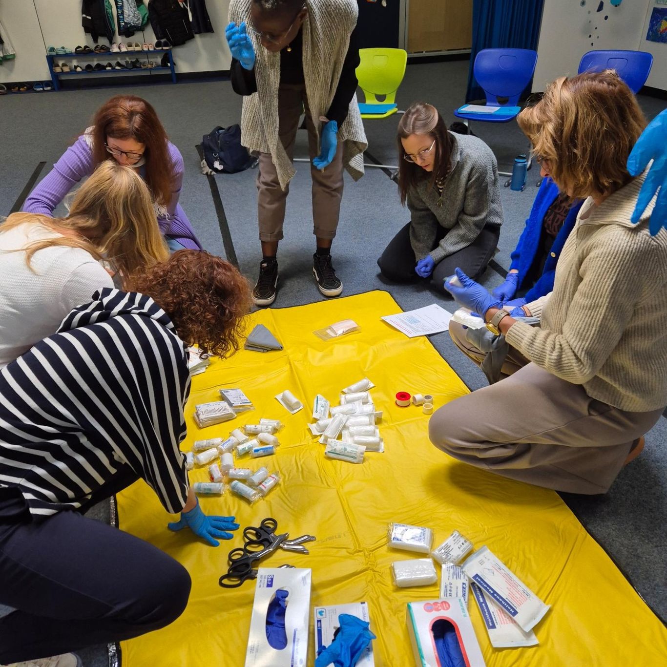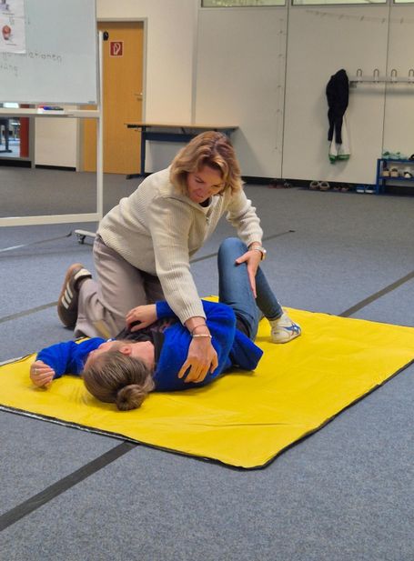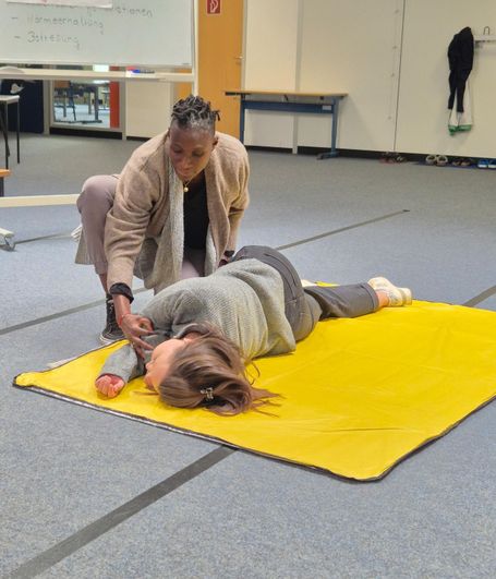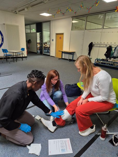 Gemeinsam mit einer Ausbilderin vom Deutschen Roten Kreuz haben wir unter anderem das Verbinden verschiedener Verletzungen geübt, das richtige Verhalten für viele Gefahrensituationen besprochen, die Herz-Lungen-Massage an einer Erste-Hilfe-Puppe getestet und unsere Wissen über die stabile Seitenlage aufgefrischt.